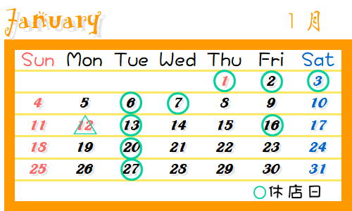 | 元旦~3日 1/4 1/12 1/16 5/11~5/15 9/3~4 9/9 11/11 12/9 12/31 |